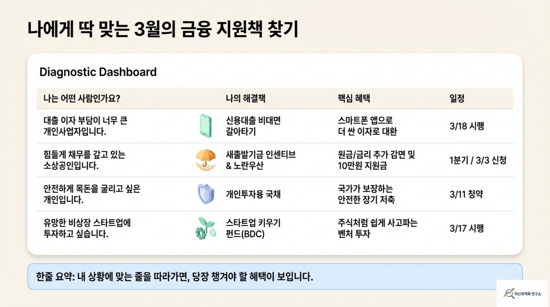 - #2026년3월금융정책 #소상공인혜택 #개인사업자대출 #비대면대환대출 #금리인하 #새출발기금 #성실상환인센티브 #노란우산공제 #도약지원금 #개인투자용국채 #국채청약 #BDC #기업성장집합투자기구 #비상장주식투자 #스타트업펀드 #보험수수료공개 #금융투명성 #혁신금융서비스 #규제샌드박스 #핀테크창업 #전세사기피해구제 #채무조정 #금융캘린더 #자산최적화 #스마트투자 #디지털금융 #국가보장저축 #금융비서 #나침반전략 #액션체크리스트