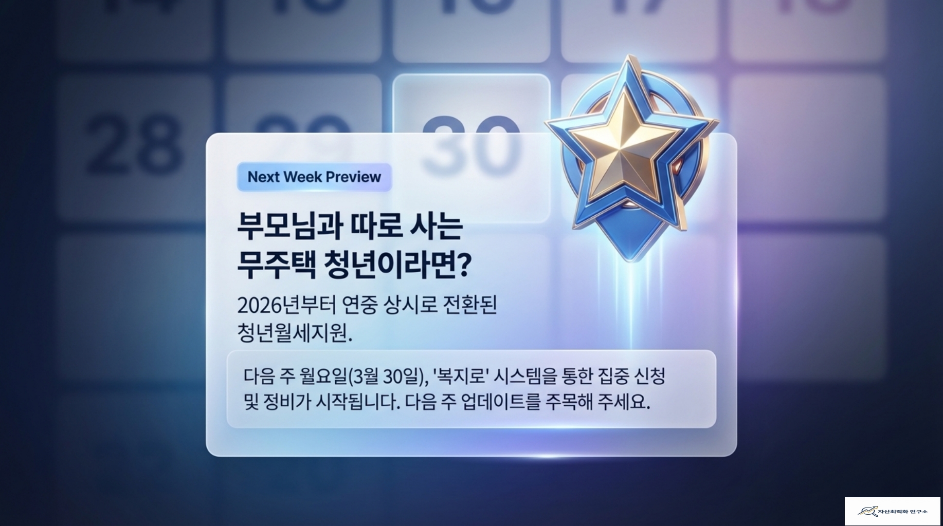 - 다음 주 예고: 3월 30일(월)부터 무주택 청년을 위한 청년월세지원 집중 신청이 시작됩니다.